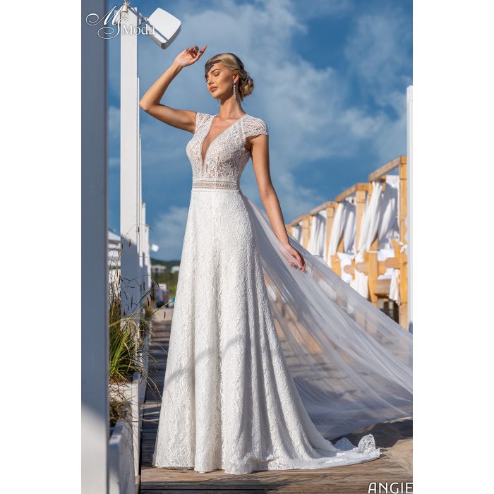 Elegancka suknia ślubna ANGIE z kolekcji 2024. Kolor: iv. Fason: litera_A | rozkloszowana. Dekolt: V. Materiał: koronka. Styl: romantyczny | nowoczesny.