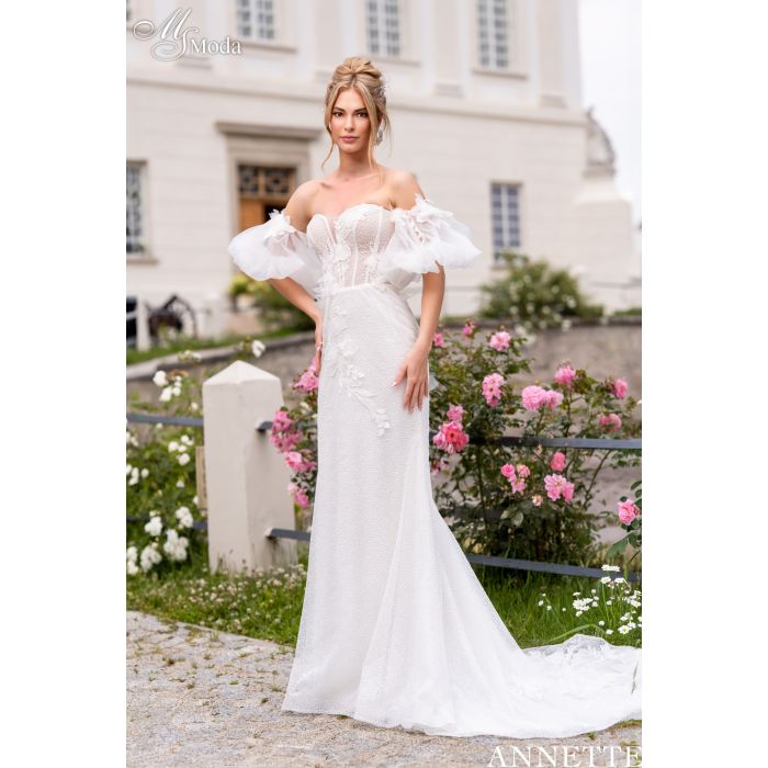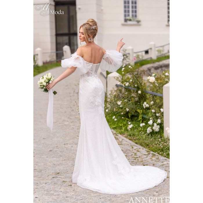 Zmysłowa i romantyczna, ta kreacja w fasonie syreny zachwyca lekkością i delikatnością detali. Gorset o półprzezroczystej strukturze został ozdobiony koronkowymi aplikacjami i pionowymi wstawkami, które subtelnie modelują sylwetkę. Opadające rękawy z lekkiego tiulu, udekorowane kwiatowymi kompozycjami 3D, dodają stylizacji bajkowego uroku. Spódnica dopasowana do linii bioder płynnie przechodzi w efektowny tren, który podkreśla elegancję całości. To idealna propozycja dla panny młodej marzącej o nowoczesnym romantyzmie z nutą finezji.