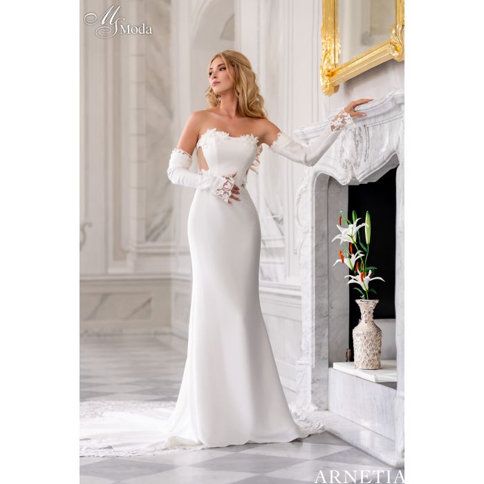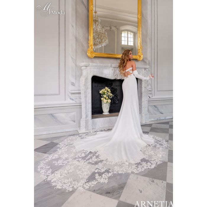 Elegancka suknia ślubna ARNETIA z kolekcji 2025. Kolor: iv. Fason: rybka. Dekolt: wysoki | serce | bez_ramion. Rękawy: dlugie | odpinane. Materiał: koronka | krepa | satyna. Styl: romantyczny | nowoczesny.