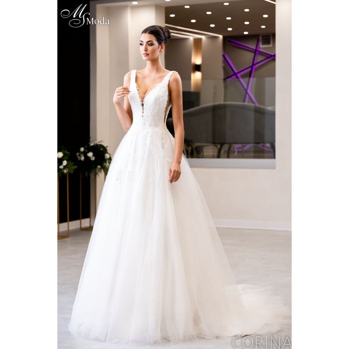 Elegancka suknia ślubna CORINA z kolekcji 2023. Kolor: wh / iv. Fason: rozkloszowana | ksiezniczka. Dekolt: V | iluzja. Rękawy: paski. Materiał: tiul | koronka. Styl: klasyczny.