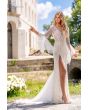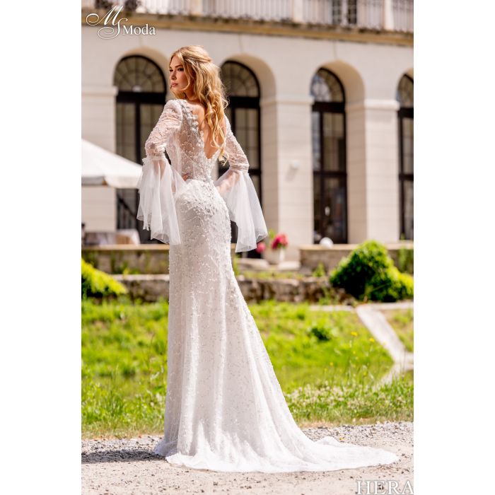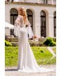 Efektowna i pełna wdzięku, ta suknia ślubna w fasonie syreny została w całości wykonana z bogato zdobionej koronki, która nadaje stylizacji tekstury i subtelnego blasku. Dopasowany krój pięknie podkreśla kobiecą sylwetkę, a wysokie rozcięcie na nodze dodaje zmysłowości i lekkości. Gorset z dekoltem w kształcie litery V ozdobiony jest trójwymiarowymi kwiatami 3D, które płynnie przechodzą na rękawy, tworząc spójną, romantyczną całość. Długie rękawy zakończone są lekkimi, transparentnymi żabotami, które poruszają się z wdziękiem i nadają sukni bajkowego charakteru. To idealna propozycja dla panny młodej, która pragnie wyglądać elegancko, kobieco i niebanalnie.