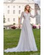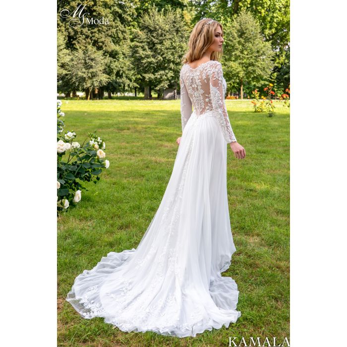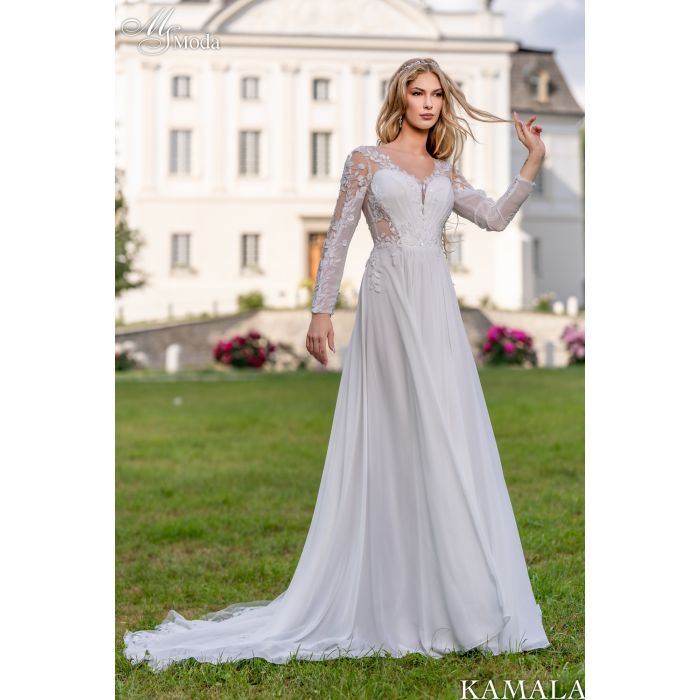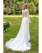 ta suknia ślubna to subtelne połączenie romantyzmu i lekkości w nowoczesnym wydaniu. Wykonana z delikatnej żorżety, miękko układa się na sylwetce, tworząc płynną linię i elegancki tren. Transparentny gorset z głębokim dekoltem w kształcie litery V został ozdobiony aplikacjami o kwiatowym motywie, które przechodzą na długie, tiulowe rękawy, dodając całości finezji i eterycznego charakteru. Prześwity w bocznych partiach gorsetu nadają sukni subtelnej zmysłowości. Suknia ta to idealna propozycja dla panny młodej, która ceni delikatne detale i klasyczną formę z romantycznym akcentem.