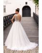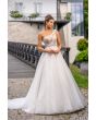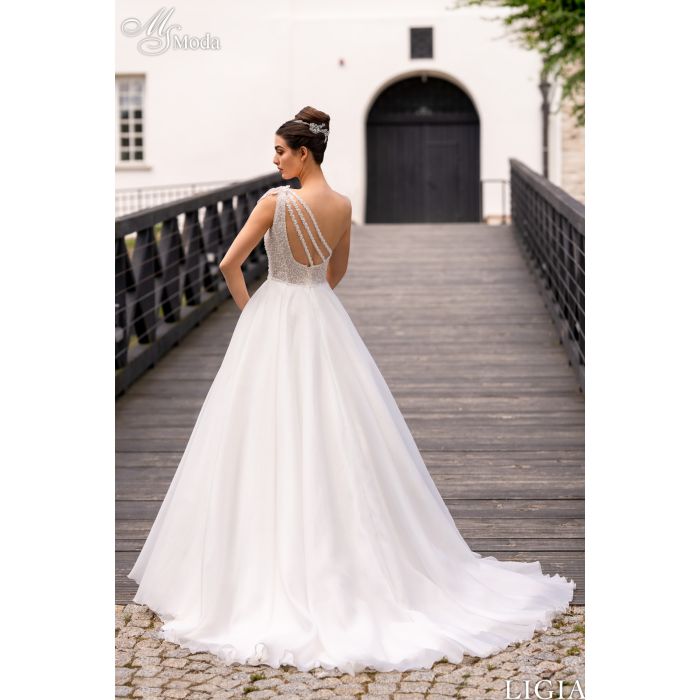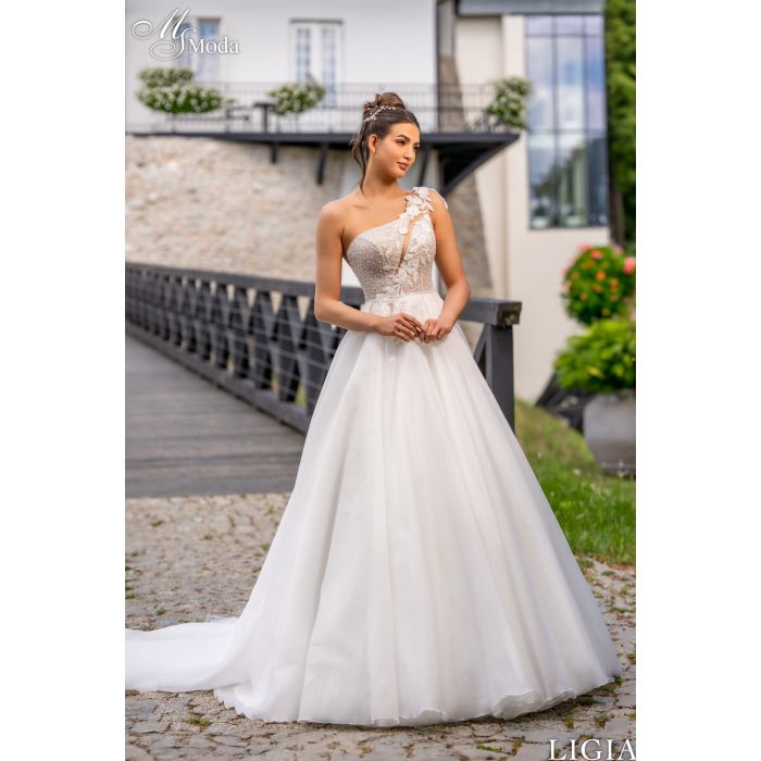 Zmysłowa i nowoczesna, ta suknia ślubna przyciąga wzrok asymetrycznym dekoltem na jedno ramię, subtelnie ozdobionym aplikacjami i perełkami. Gorset z transparentnym wycięciem w kształcie łezki na linii biustu nadaje stylizacji lekkości i finezji. Tył sukni zachwyca delikatnymi paskami eksponującymi odkryte plecy. Całość dopełnia rozkloszowana spódnica z miękkiej organzy, która miękko układa się w ruchu i kończy lekkim trenem. To wybór dla panny młodej ceniącej elegancję z odrobiną śmiałości.