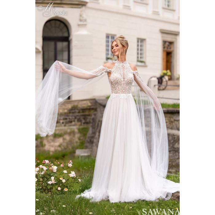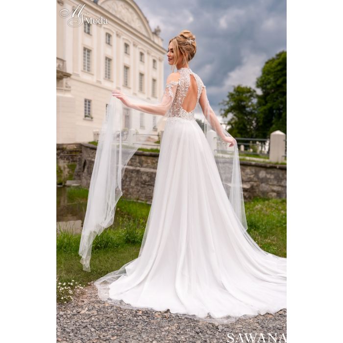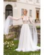 Ta romantyczna suknia została uszyta z delikatnego tiulu i misternie zdobiona koronką, która subtelnie oplata górę z efektownym amerykańskim dekoltem i zmysłowym wycięciem na plecach. Zwiewna spódnica nadaje sylwetce lekkości i wdzięku, a dopinane, tiulowe rękawy tworzą efekt pelerynki, wprowadzając do stylizacji nutę bajkowego uroku. To idealna propozycja dla panny młodej, która pragnie wyglądać zjawiskowo i niebanalnie, zachowując jednocześnie lekkość i elegancję w stylu boho.