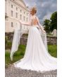 Ta romantyczna suknia została uszyta z delikatnego tiulu i misternie zdobiona koronką, która subtelnie oplata górę z efektownym amerykańskim dekoltem i zmysłowym wycięciem na plecach.