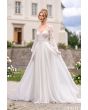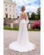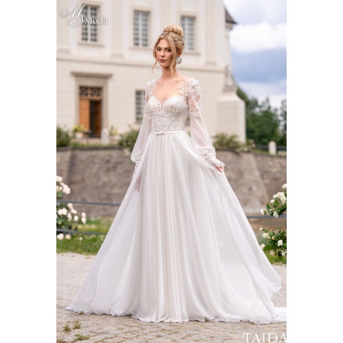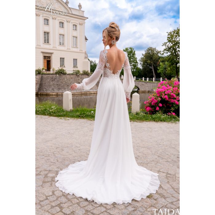 Ta suknia ślubna została wykonana z delikatnej żorżety i bawełnianej koronki. Zwiewna, luźno opadająca spódnica nadaje sylwetce lekkości i naturalnego wdzięku, a subtelny paseczek w talii pięknie ją podkreśla. Góra sukni z przezroczystym koronkowym gorsetem zachwyca drobiazgowym wykończeniem i romantycznym charakterem. Długie, lekko bufiaste rękawy zakończone koronkowymi mankietami dodają jej elegancji, a głębokie wycięcie pleców sprawia, że kreacja staje się zmysłowa, nie tracąc przy tym klasy. To idealna propozycja dla panny młodej, która pragnie wyglądać romantycznie, eterycznie i naturalnie w dniu swojego ślubu.