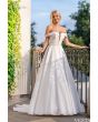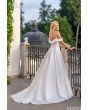 Suknia wykonana z eleganckiej tkaniny mikado zachwyca swoją klasyczną formą i królewskim charakterem. Gładka, szeroka spódnica pięknie się układa, tworząc efektowny tren. Gorset z głębokim dekoltem oraz opadającymi ramiączkami podkreśla ramiona i dekolt. Talia została zaakcentowana delikatnym, biżuteryjnym paskiem, dodając całości subtelnego blasku. Ten model to idealny wybór dla panny młodej, która marzy o nowoczesnej wersji ponadczasowej klasyki z nutą luksusu.