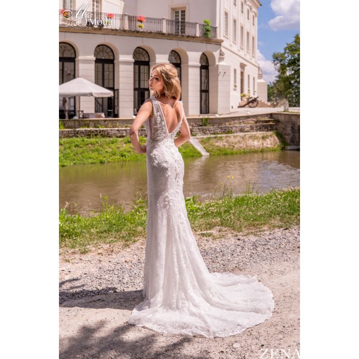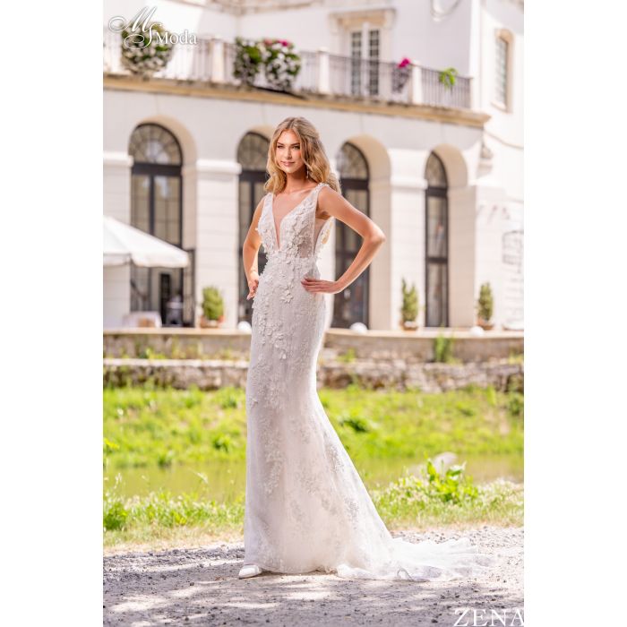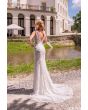 Suknia wykonana z delikatnej koronki z trójwymiarowymi aplikacjami kwiatowymi subtelnie oplata sylwetkę, tworząc dopasowaną formę typu „slim fit”. Głęboki dekolt oraz odkryte plecy nadają kreacji zmysłowości, a przezroczyste boczne wstawki podkreślają nowoczesny charakter projektu. To propozycja dla panny młodej, która pragnie olśniewać elegancją w artystycznym, kobiecym wydaniu.