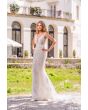 Suknia wykonana z delikatnej koronki z trójwymiarowymi aplikacjami kwiatowymi subtelnie oplata sylwetkę, tworząc dopasowaną formę typu „slim fit”.